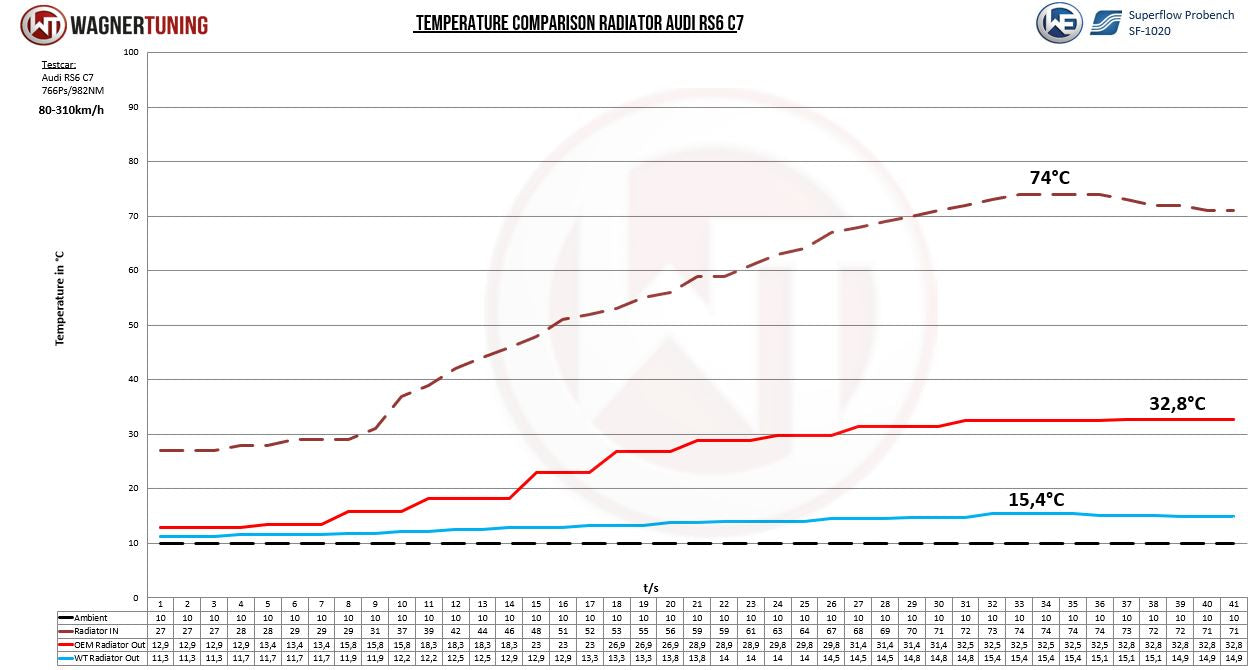 The Audi RS6 and RS7 models feature an indirect charge air cooling circuit, where the charge air is cooled by a separate cooling water circuit. Lowering the cooling water temperature directly improves charge air cooling performance and enhances overall engine efficiency. The Wagner Tuning racing core increases the radiator volume by 102% compared to the stock unit, optimizing the heat transfer ratio between the inner and outer cooling surfaces for maximum effectiveness.